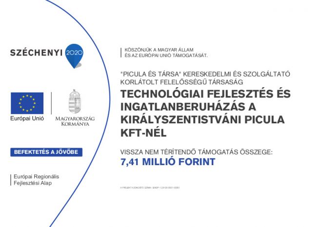 A "PICULA és Társa" Kereskedelmi és Szolgáltató Korlátolt Felelősségű Társaság a GINOP-1.2.9-20-2021-03351 azonosítószámú, „Technológiai fejlesztés és ingatlanberuházás a királyszentistváni Picula Kft-nél” című projektje során a királyszentistváni telephely infrastrukturális fejlesztésének és eszközök beszerzésének támogatását, valamint 2 fő munkabérének támogatását veszi igénybe. A projekt 2021.010.01-2023.03.24. között valósul meg, összköltsége 10 580 920 Ft, az igényelt támogatás nagysága ennek 70 %-a, azaz 7 406 644 Ft.